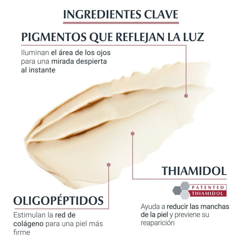 1. Thiamidol® Patentado (Ingrediente Estrella) Reduce la producción de melanina desde el día 1, aclarando progresivamente las ojeras oscuras. Clínicamente probado en la reducción de manchas hasta un 75% con uso continuado. Previene la reaparición de nuevas manchas oscuras y unifica el tono de la piel del contorno.