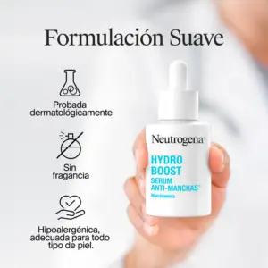 El Sérum Anti-manchas Hydro Boost se diferencia por su alta concentración de niacinamida al 10% y neoglucosamina, específicamente formulados para tratar manchas, unificar el tono y refinar poros. Mientras que otros sérums de la línea se enfocan principalmente en hidratación, este ofrece beneficios adicionales de exfoliación suave y tratamiento de manchas.
